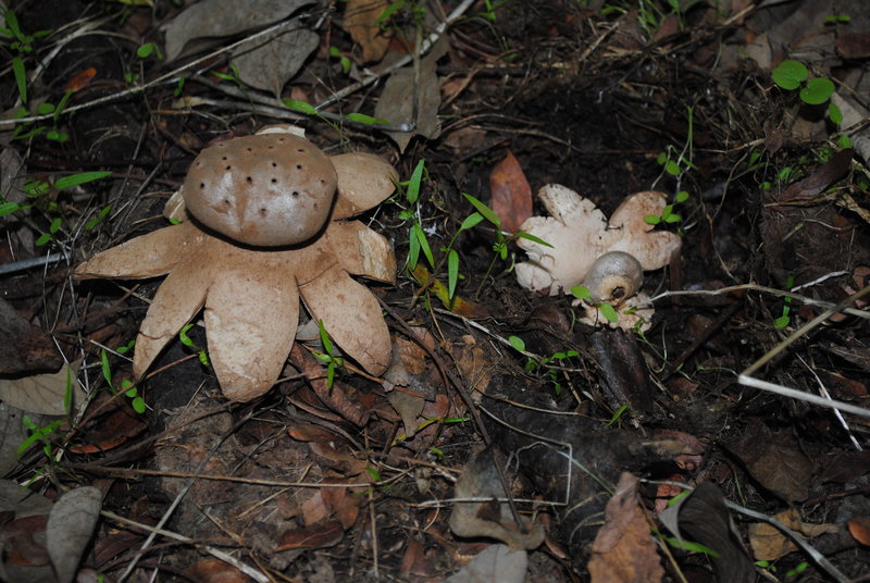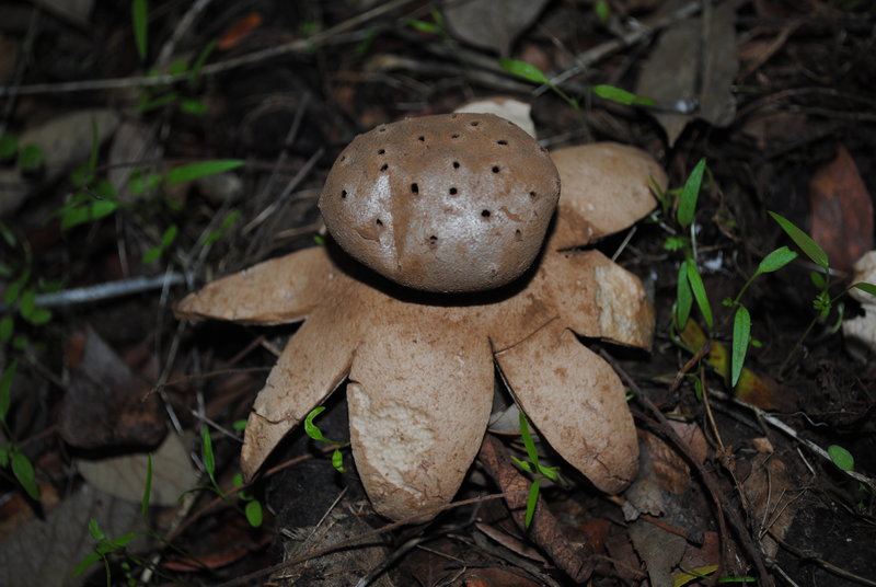 Termőtest: kiterülve 5–8 cm széles. Külső burka idővel 7–8 okkerszürke, barnásokker színű, ráncos, repedezett, karéjszerű lebenyre hasad, melyek csillagszerűen hajolnak szét. Fejecskéje több, 3–12 nyéllel csatlakozik a külső burokhoz, a lebenyekhez hasonló színű, 2–3 cm átmérőjű. Több csúcsi nyílása szitaszerűen helyezkedik el, csíkozatlan, udvar nélküli.